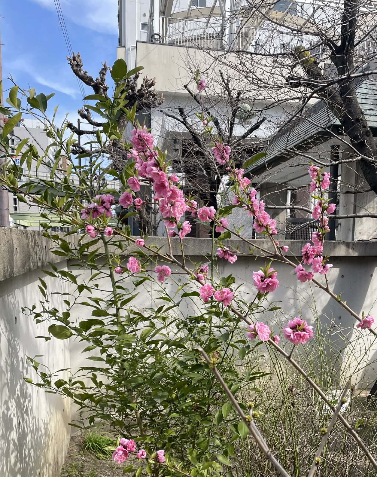 六地蔵さまの背中には、ハナモモの華やかなピンク色、本堂前には雪柳も。先日まではモクレンも満開でした。