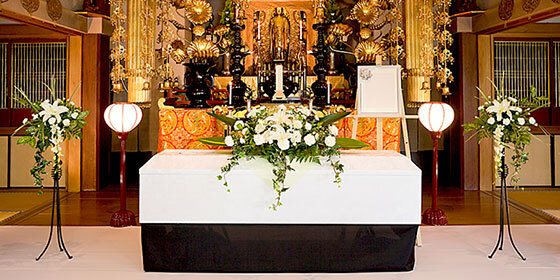 ご本尊に導かれてのご葬儀は、お寺ならではのものです。一般の葬儀会館のように他のお葬式が併用することがありませんから、ゆっくりと心を込めて送ることができます。葬儀全般のお世話は、大蓮寺指定の葬儀社・阿波弥が担当します(家族葬以外の一般葬も受け付けます)。